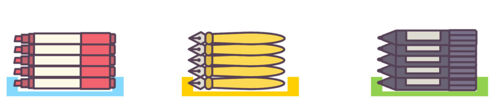 例:赤いペンは青い箱に5本だけ入れる